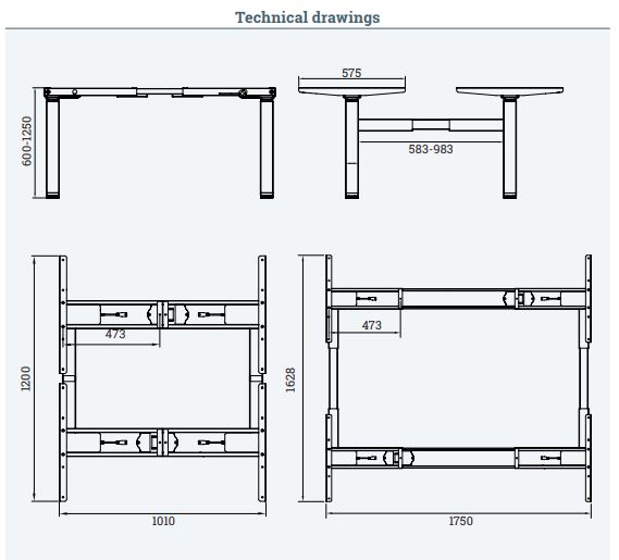 De framebreedte is verstelbaar van 1010 mm tot 1750 mm, waardoor het bureau kan worden aangepast aan verschillende tafelbladformaten. Het bureau is compatibel met tafelbladen van minimaal 2x 600x1050 mm tot maximaal 2x 1000x2000 mm, waardoor je voldoende ruimte hebt om comfortabel te werken.