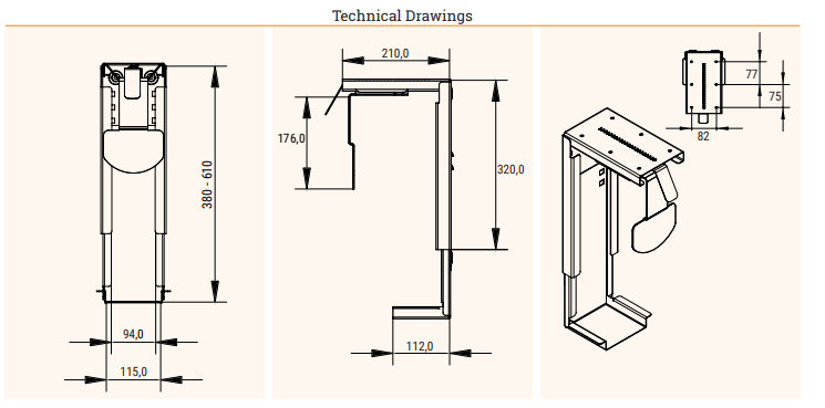 - Afmetingen: Verstelbare hoogte van 380 tot 610 mm en breedte van 85 tot 220 mm, geschikt voor diverse desktopformaten.