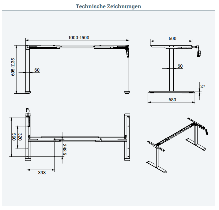 Dit bureau is uitgerust met een hefkolom die uit drie segmenten bestaat, waardoor het eenvoudig verstelbaar is voor een comfortabele werkhoogte. De kolom heeft een doorsnede van 60x90 mm, wat zorgt voor stabiliteit en een robuuste bouw. Het hefbereik van het bureau ligt tussen 695 mm en 1135 mm, waardoor het geschikt is voor verschillende werkposities, van zittend tot staand.